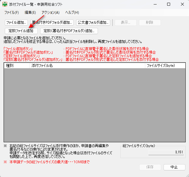 ※2026年から「ファイル追加」ではなく「定款ファイル追加」に変わりました。従来の「ファイルを追加」は委任状情報を貼付する際に使用します。